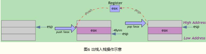 出栈(pop):栈顶指针ESP指向的栈中数据被取回到寄存器;栈顶指针ESP增加4个字节。